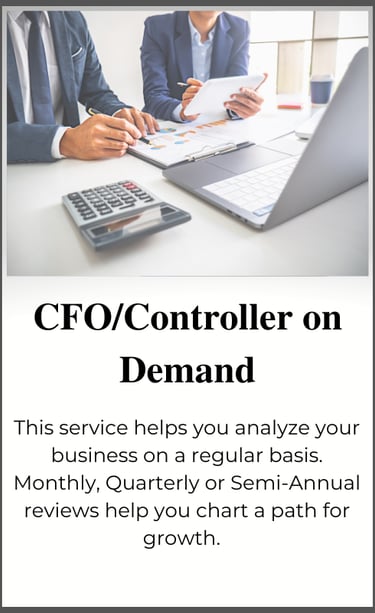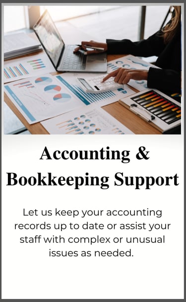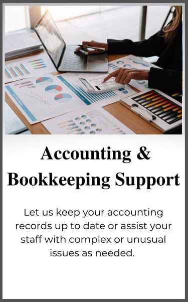 We offer a full array of services to compliment and expand upon the services offered by the traditional accounting firm, performed by experienced professionals who understand your industry. A small sample of our services are shown below. Contact us today to find out what we can do for you.